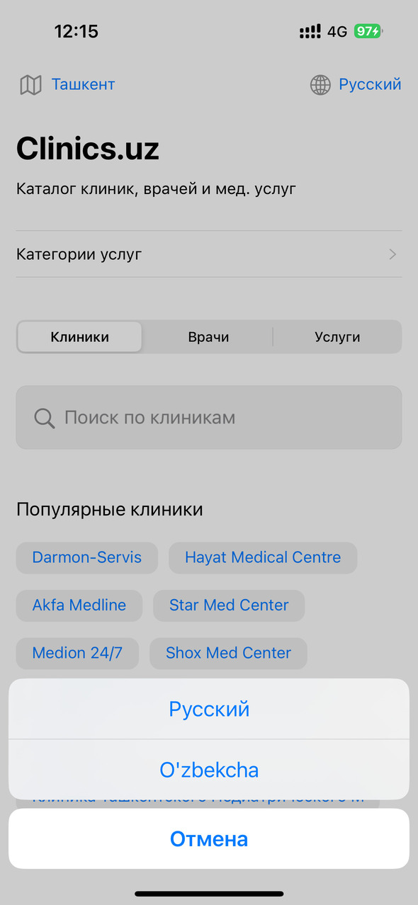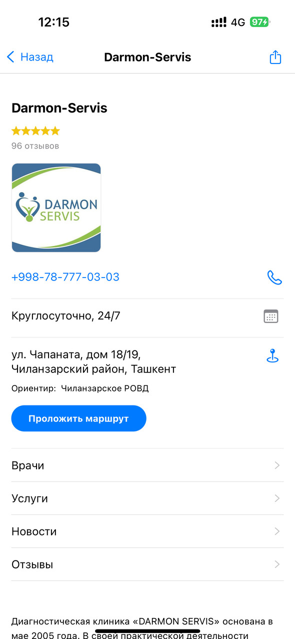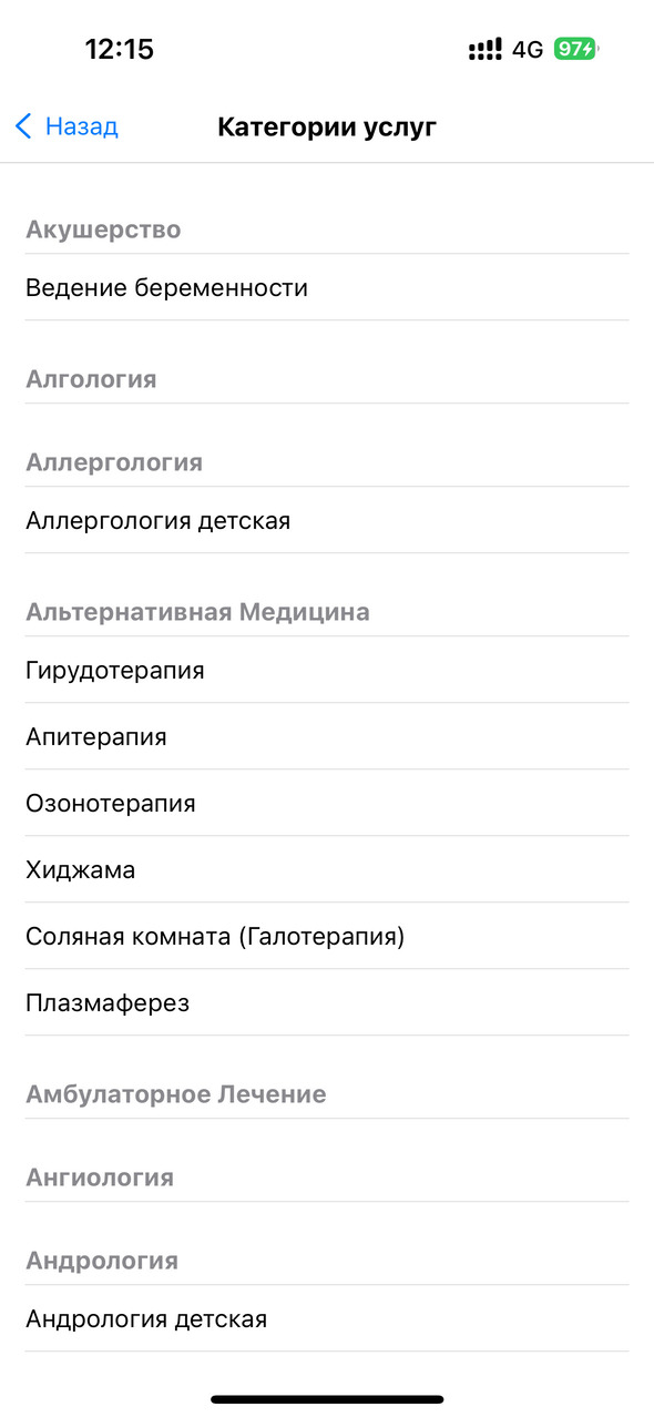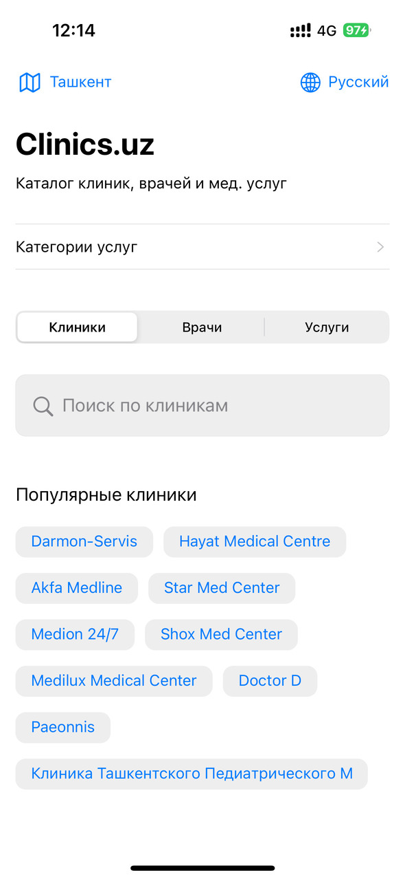 - Удобная навигация: поиск по категориям медицинских услуг и клиник.