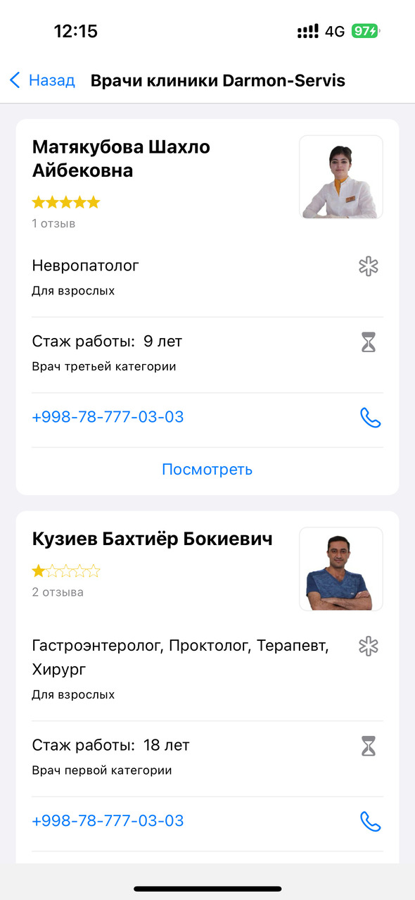 - Детальные профили врачей: информация о специализации и опыте каждого специалиста;