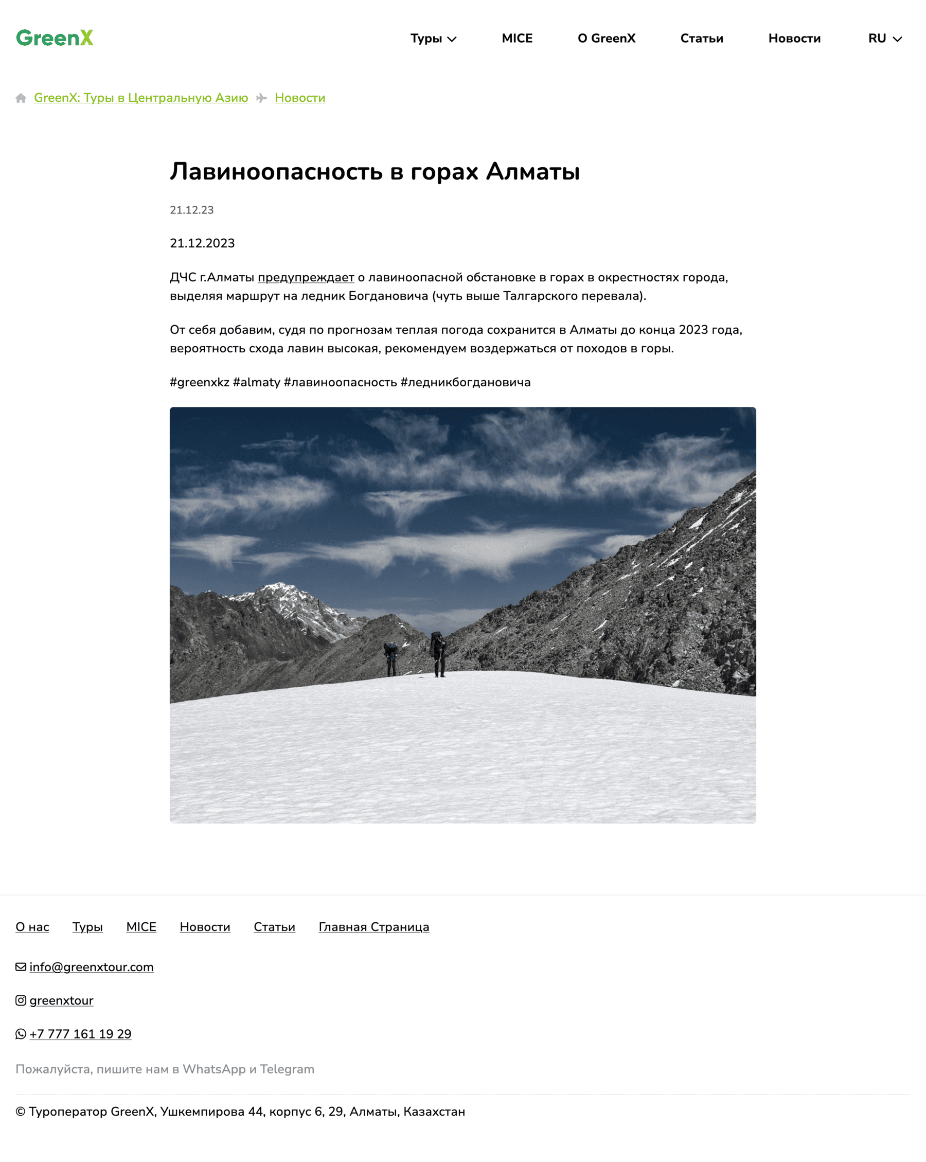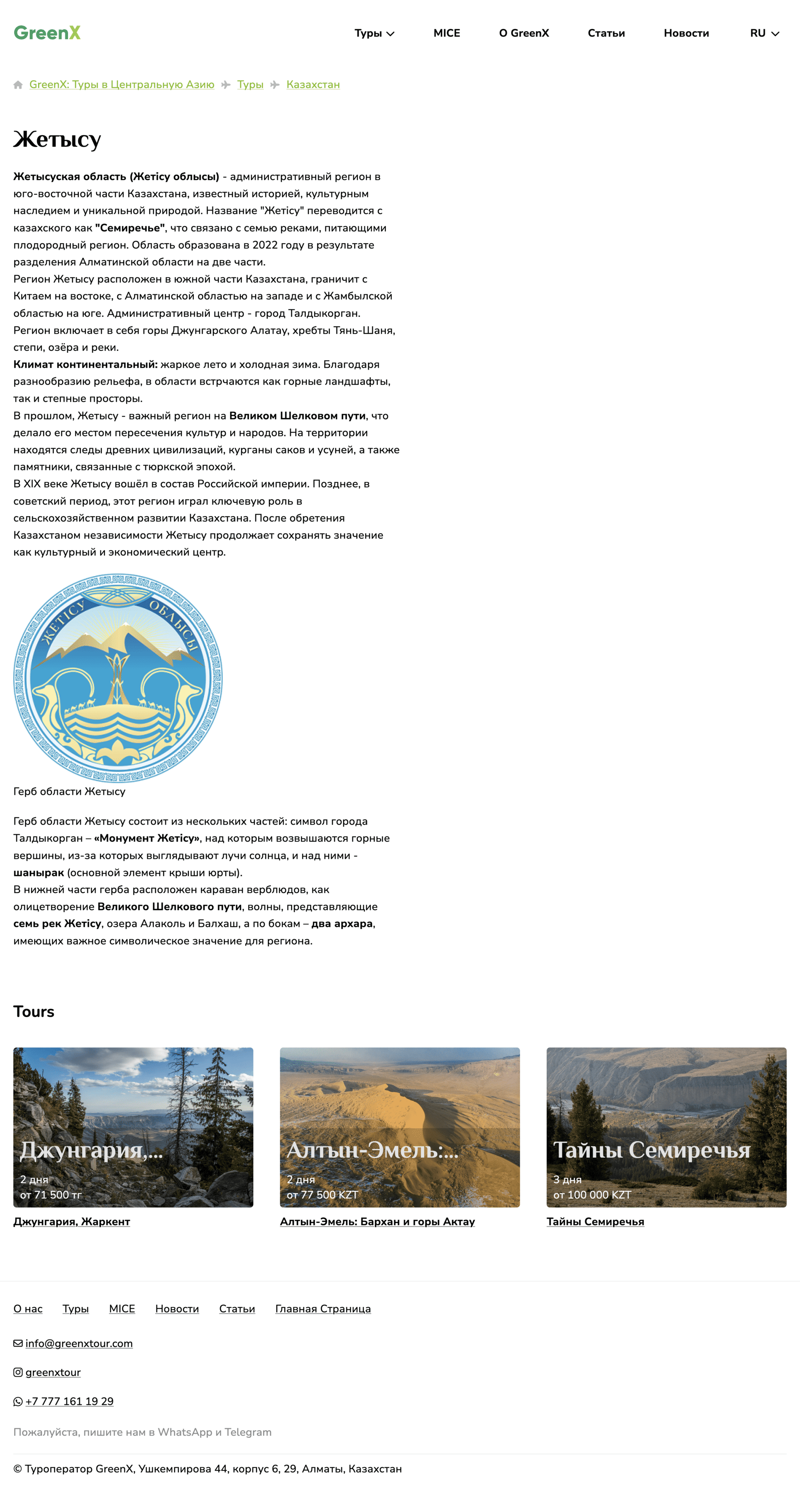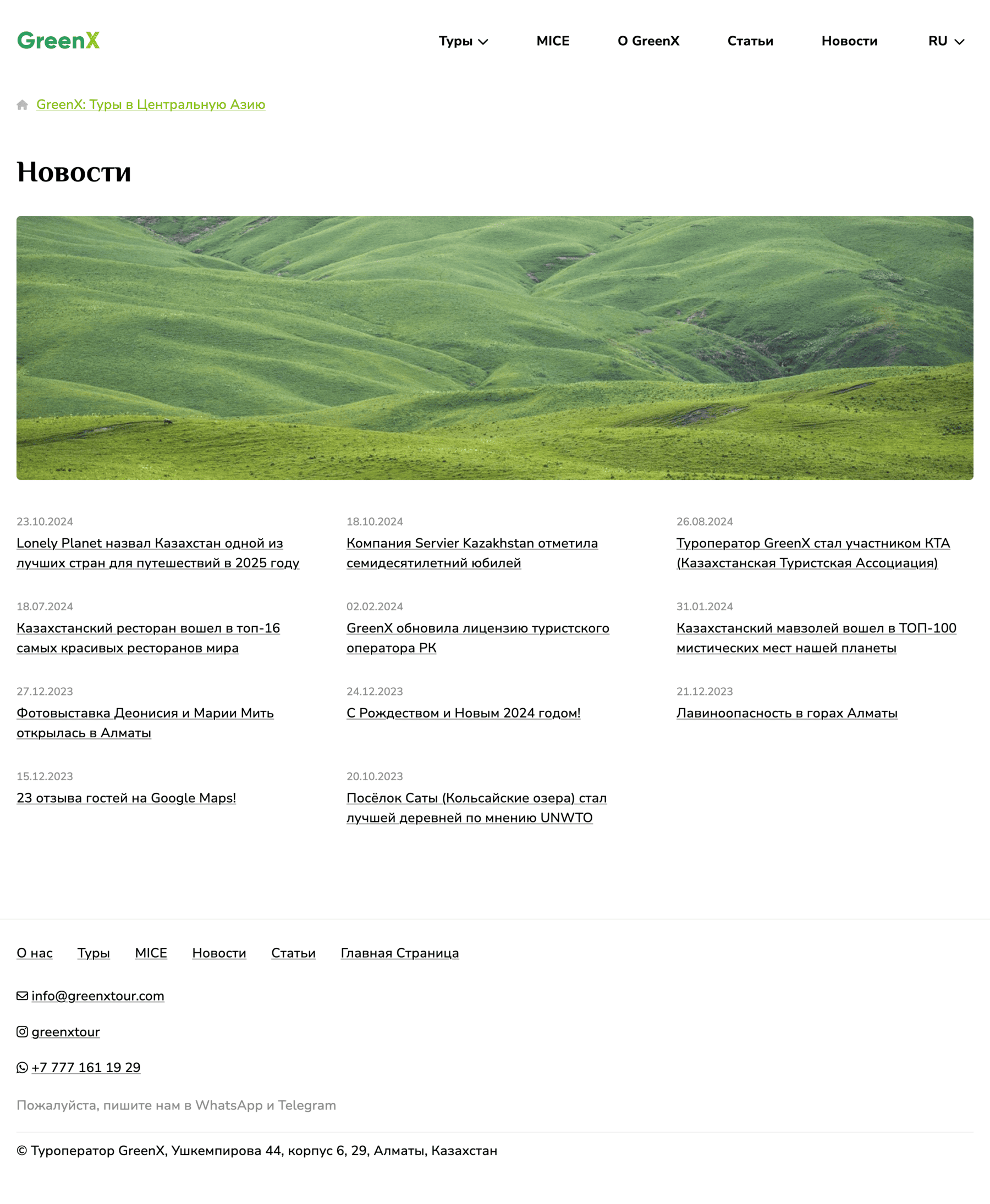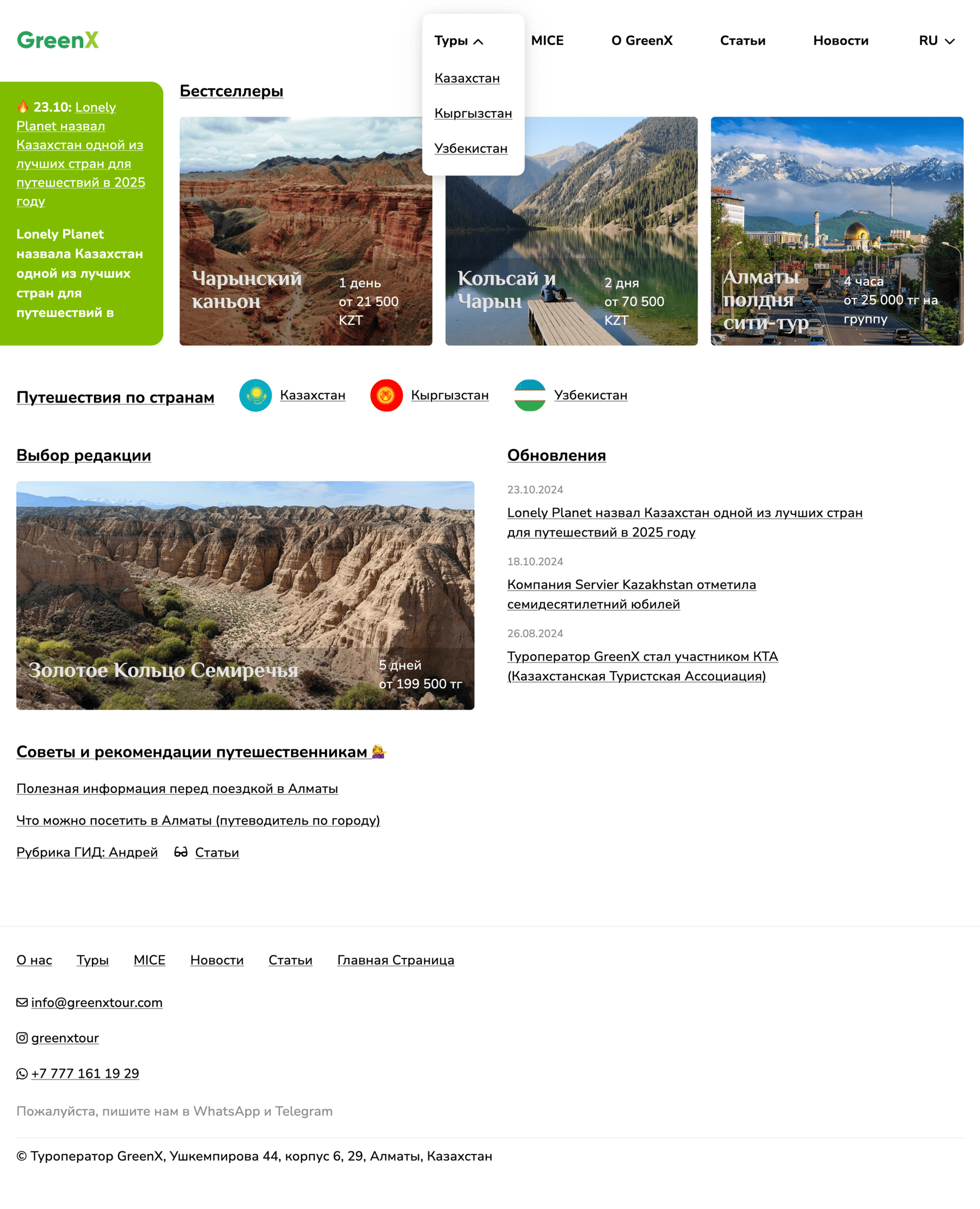 В мае 2022 года к нам обратилась компания GreenX с заказом на разработку сайта «под ключ». Основная цель проекта – познакомить посетителей с разнообразием туров по живописным местам Казахстана. Наша команда с энтузиазмом принялась за работу.